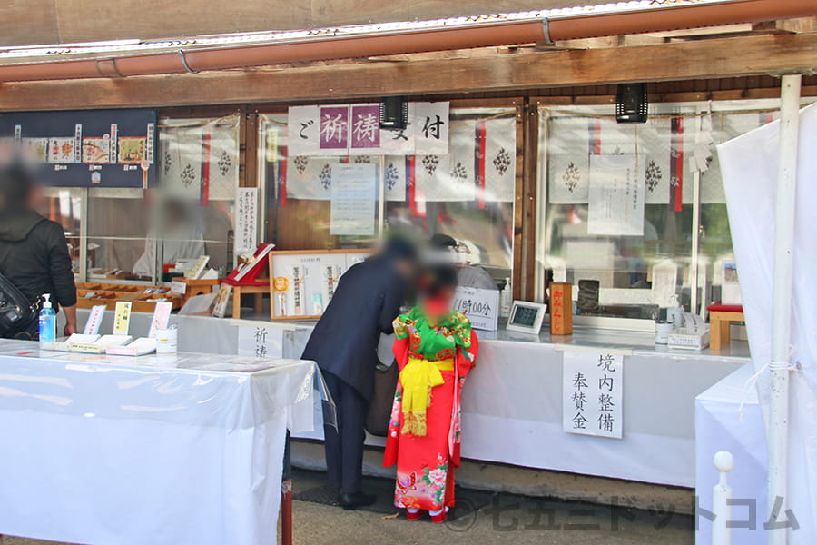 御祈祷受付窓口の手前に御祈祷の申込用紙が置かれた記入所があるので、そこで申込用紙に記入をして窓口にて、七五三の御祈祷の申し込みを行います。