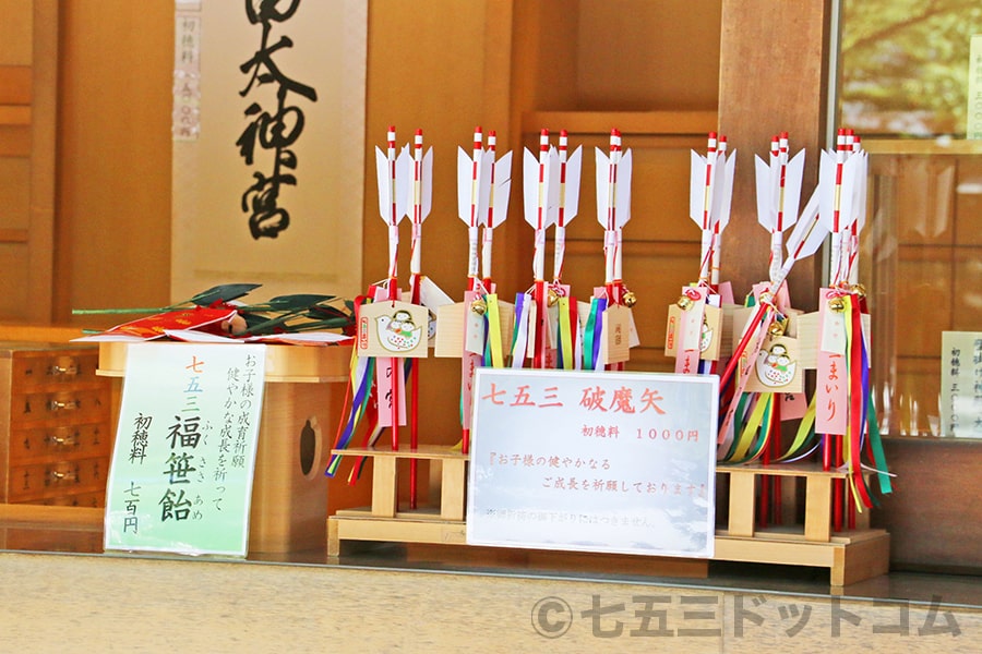 ※熱田神宮 授与所に陳列の七五三のお参りシーズンに頒布される七五三破魔矢と七五三福笹飴の様子|画像提供:七五三ドットコム