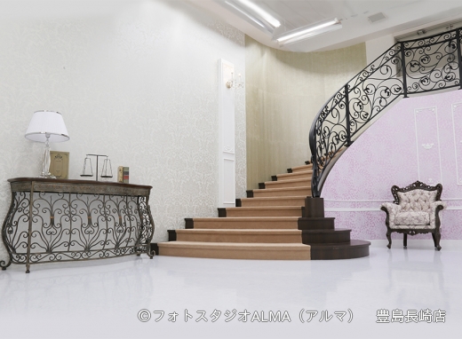 バリアフリーのスタジオで、古典撮影から空間撮影まで可能。新たな雰囲気での撮影をお楽しみいただけます。中でも螺旋階段があるのは、東長崎店だけになります!