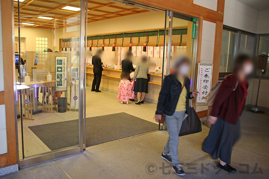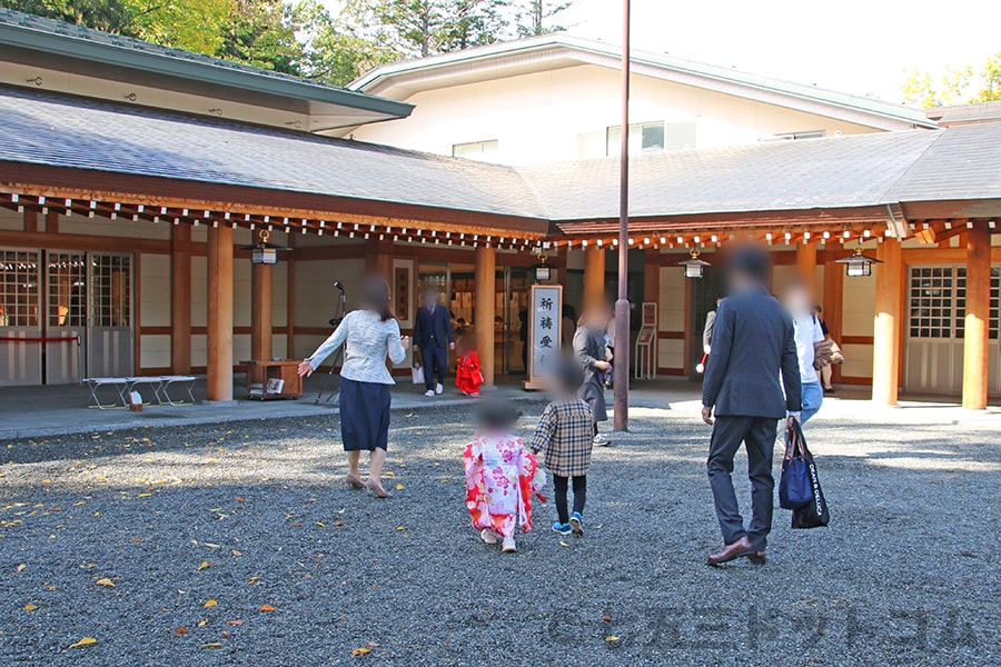 ※北海道神宮 御祈祷の申し込みに祈祷受付所に向かう七五三ご家族の様子|画像提供:厄年・厄除け厄祓いドットコム