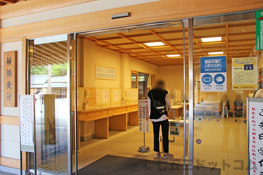 御祈祷の申し込み・受付を行う祈祷受付所は、北海道神宮の拝殿・本殿のある囲まれた玉垣内、拝殿・本殿の右手にある