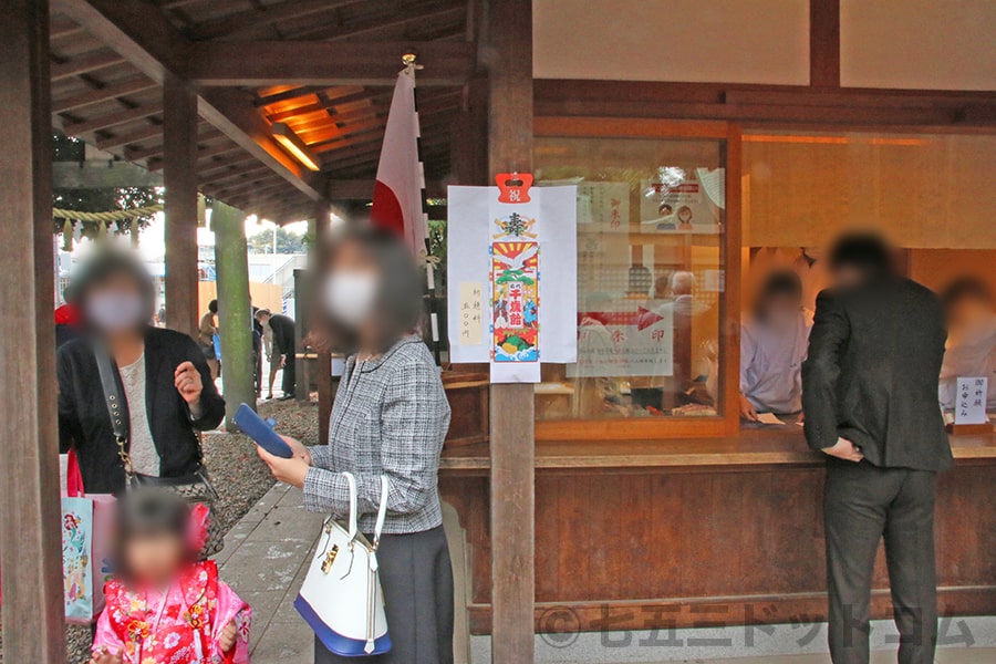 まずは七五三の御祈祷の申し込みを行います。御祈祷の受付は写真の本殿向かいにある社務所、受付窓口にて行います(こちらの窓口は普段は御朱印の受付なのですが、七五三の時期はこちらが七五三の御祈祷受付となります)。