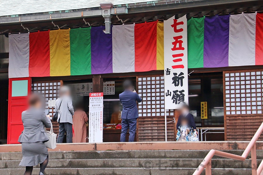 七五三の御祈祷も行われる慈恵大師堂内に祈願受付があり、その窓口の向かいに申込用紙が置かれた記入机があるので、そこで申込用紙に記入をして窓口にて申し込みを行います。