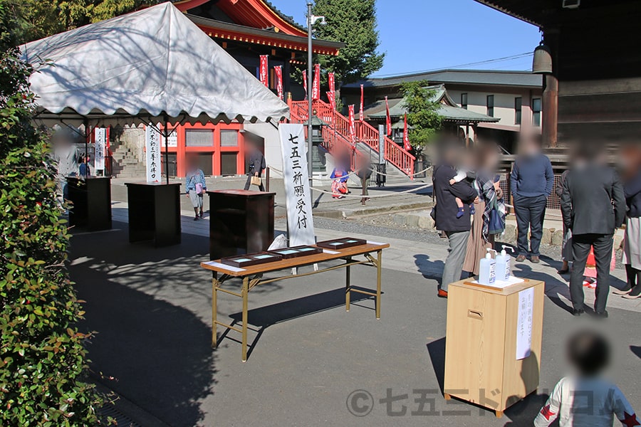 七五三のお参りシーズンには、↑写真のように不動堂の横左手のところに七五三専用の祈願受付所が設営され、そこで御祈祷の申込用紙が置かれているので、その申込用紙に記入をして、御祈祷受付窓口にて申し込みを行います。