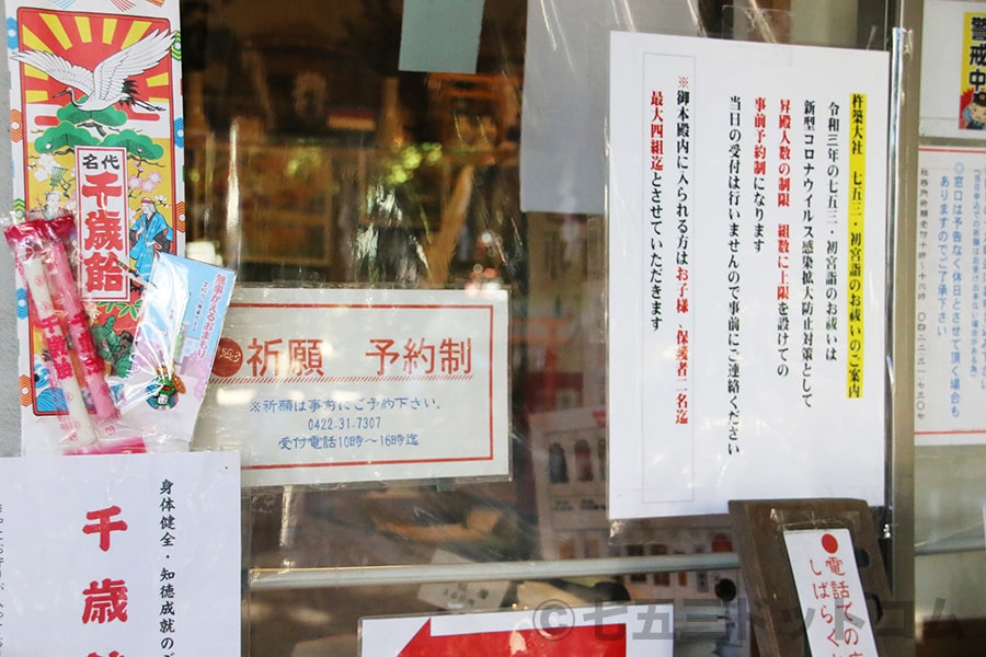 ※杵築大社 七五三をはじめとした御祈祷は予約制のみを伝える案内掲示の様子|画像提供:七五三ドットコム