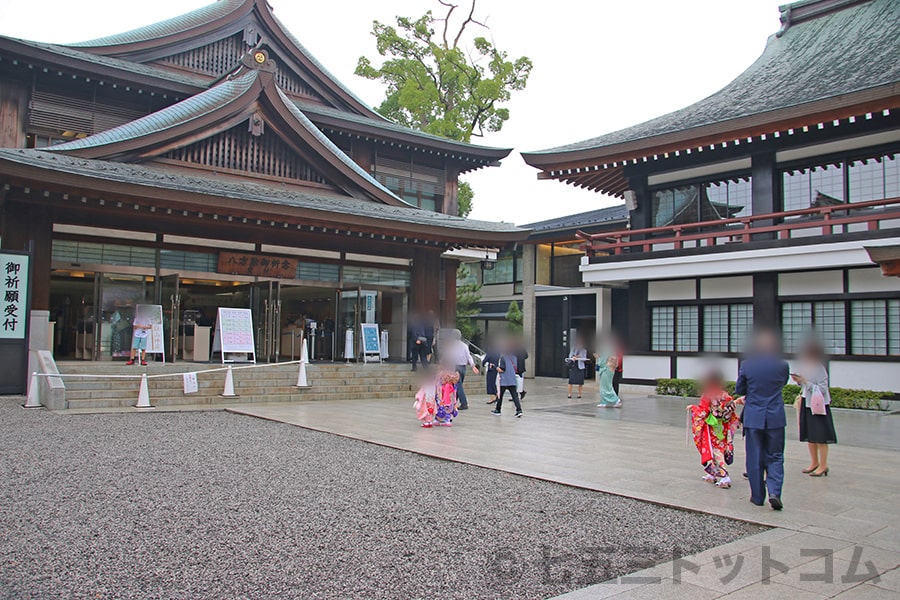 ※寒川神社 七五三の御祈祷の申し込みを行いに客殿に向かう七五三ご家族の様子|画像提供:七五三ドットコム