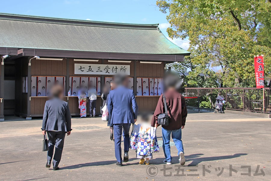 ※石切劔箭神社 七五三のお参りシーズンに臨時で設営される七五三受付所に向かう七五三ご家族の様子|画像提供:七五三ドットコム