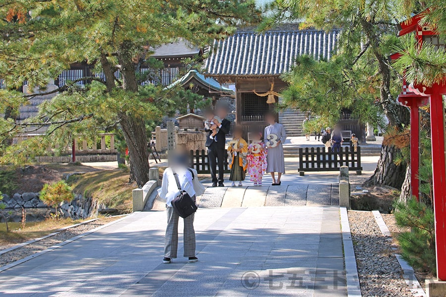 吉備津彦神社 参道で記念撮影する七五三ご家族の様子