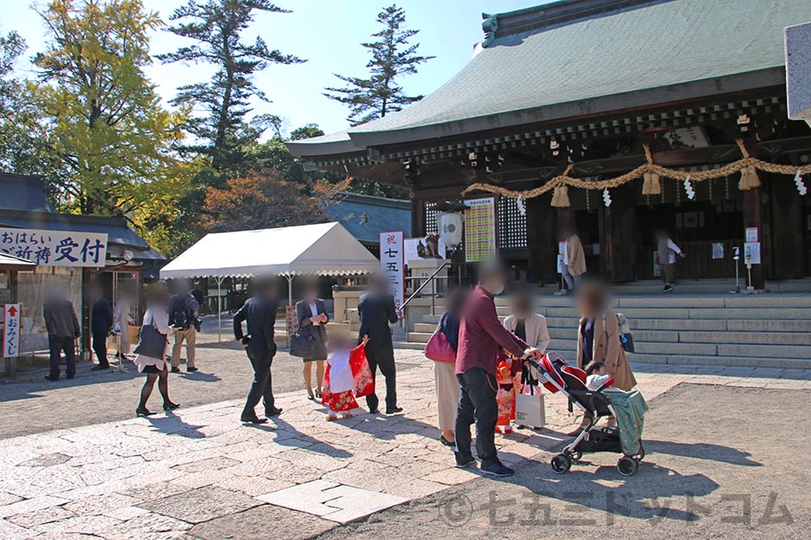 吉備津彦神社 拝殿前の七五三ご家族と賑わいの様子