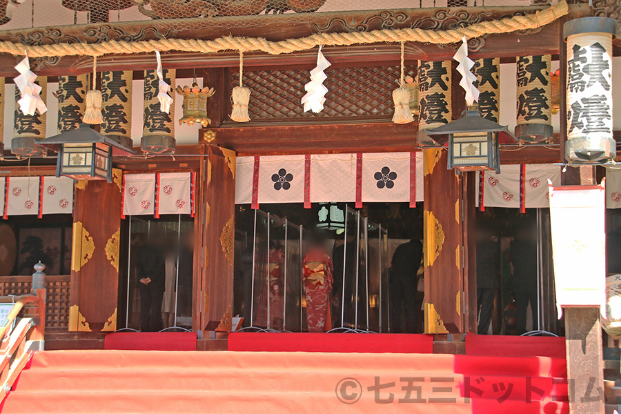 大阪天満宮 七五三の御祈祷のため本殿(拝殿)に昇殿する七五三ご家族の様子
