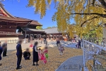 写真のように、秋の七五三お参りシーズンには境内にある一番目立つ大いちょうの御神木がきれいに色づきます。いちょうの落ち葉にも地面が敷き詰められるので、この御神木の前が七五三ちゃんたちやそのご家族が集まり、落ち葉で遊んだり、記念撮影を撮ったりする一大スポットにもなっています。